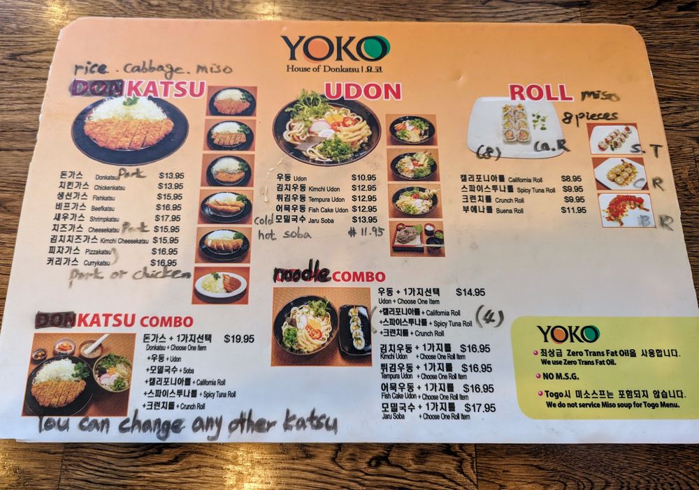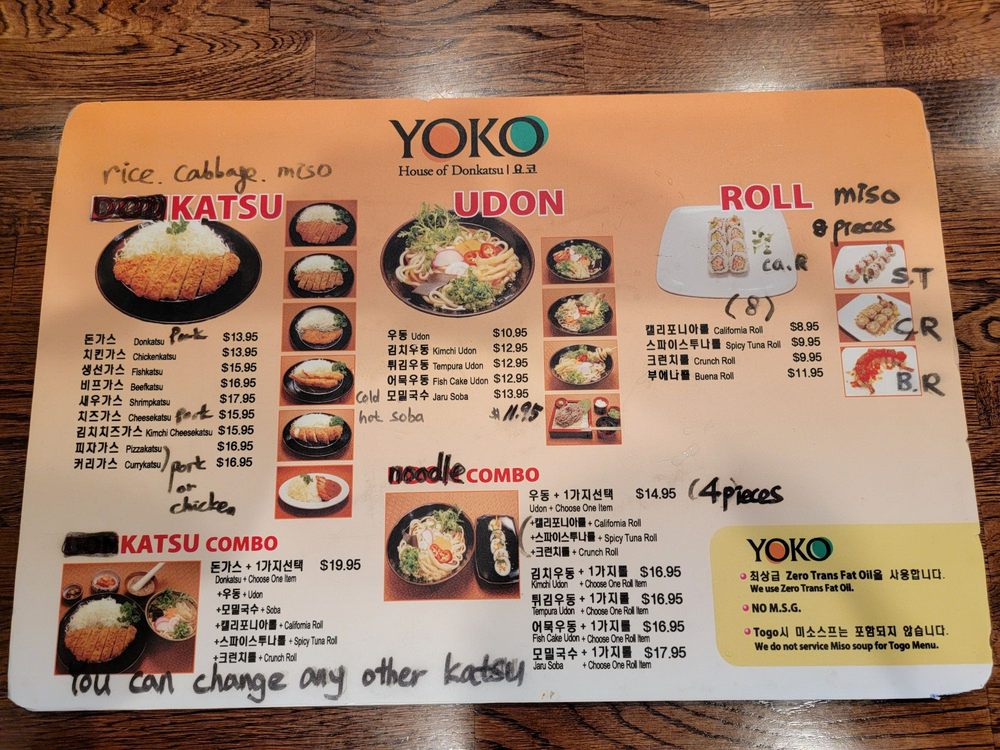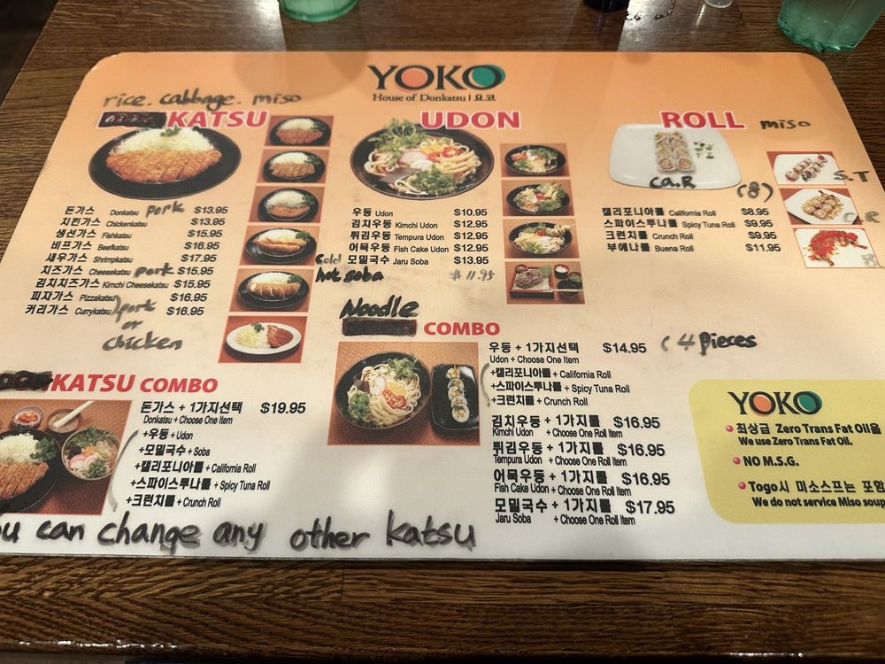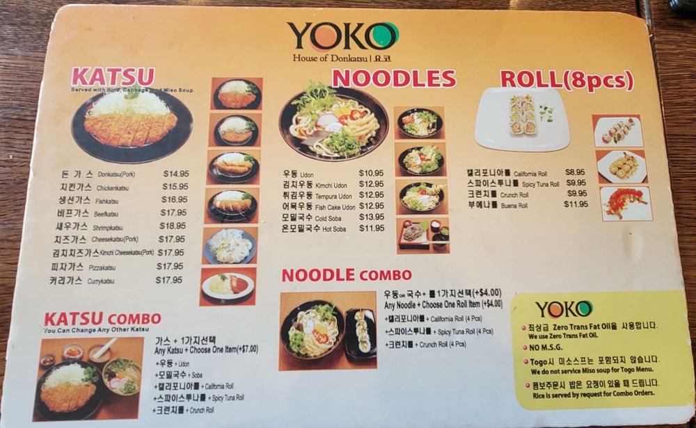 Yoko, a Japanese-Korean restaurant located in Buena Park, CA, offers a wide range of amenities and services, including takeout, delivery, and reservations. The menu features a variety of katsu dishes, with highlights such as the Kimchi cheese Katsu and the Pizzakatsu. Customers rave about the quality and flavor of the katsu, noting that it is juicy, tender, and not overly greasy. Portions are generous, and each dish comes with side options like miso soup, pickled honchon, and cabbage slaw. The unique experience of grinding sesame seeds for katsu sauce adds a fun and interactive element to the meal. With efficient and friendly service, Yoko provides a delicious dining experience that keeps customers coming back for more.